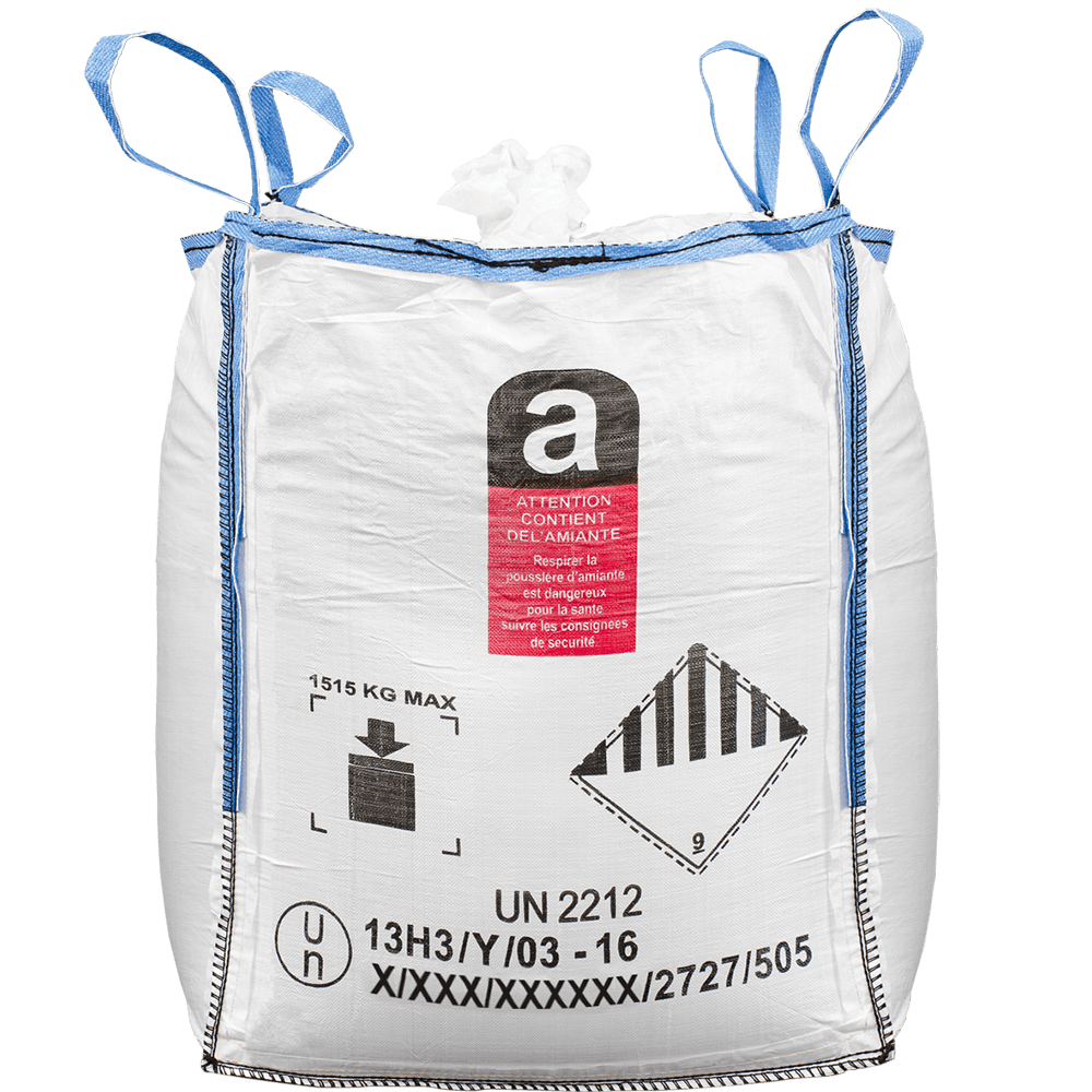 Le Big Bag amiante standard 1m3 - 90x90x110cm - 1.55 kg - capacité 1000 kg reste la solution la plus polyvalente. il convient à la plupart des applications de désamiantage et de déconstruction pour de petits chantier ou avec des problématiques de place. Résistant, homologué UN et ADR, il garantit la conformité réglementaire lors du transport des déchets dangereux.